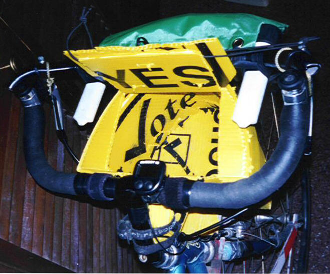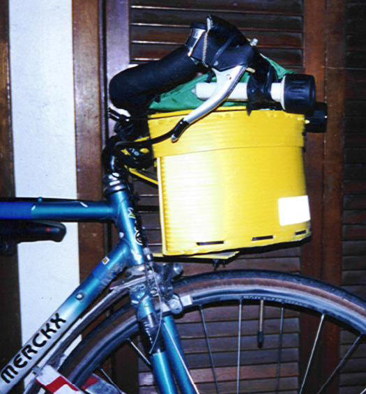 The rest of the text here is a basic explanation describing how I constructed this particular bag but anyone attempting to construct a similar bag for their own use will most likely have to modify the design to suit their bike. Please consider what I did as a set of guidelines rather than a series of instructions that must be rigidly followed. Coroplast is a very inexpensive and strong material and the best way to figure out how to work with it is to experiment. If you don't know what coroplast is or want to learn some basic coroplast construction techniques, please see my article on coroplast fender construction which can be found by clicking this link .