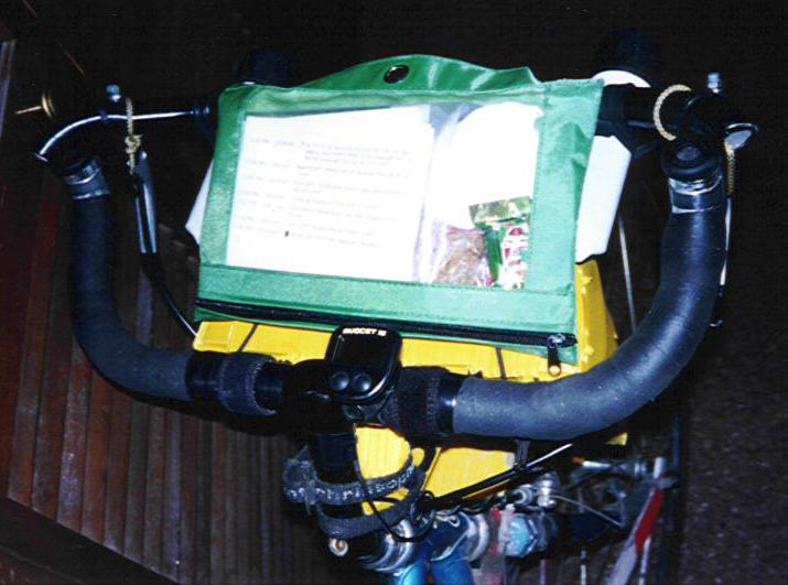 I added a couple of elastic cord loops to the edge of the trap door. These loops can be stretched over some bits of coroplast at the back of the bag and hold the trapdoor closed. I also added a small zip-tie loop to the trapdoor as a handle. For a final finishing touch, I took a green nylon clear-topped pencil pouch and strapped it to the front bar with a couple of innertube bands. I use this pencil pouch as a holder for my cue-sheets, maps and small snacks. Since the pencil case isn't 100% waterproof, it's wise to keep any maps or cue-sheets in a plastic bag inside the pencil case if there's any chance of rain.