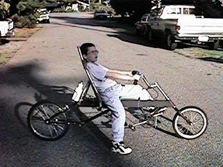 Eric on his recumbent. This was built by Kevin Coughlin and myself one weekend. The main beam is steel and the rest of the bike is parts from a 16" BMX bike, a 20" BMX bike, a backpack frame and a few miscellaneous bike parts.